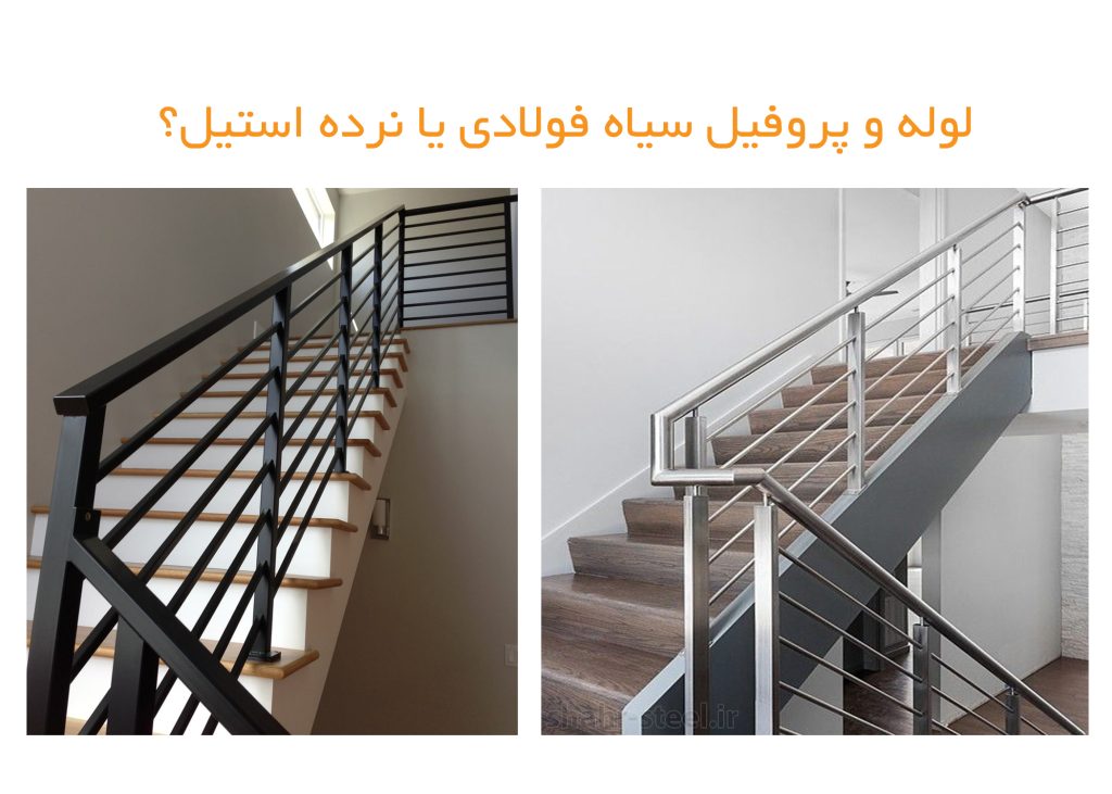 لوله و پروفیل سیاه فولادی یا نرده استیل؟ بررسی جامع تفاوت‌ها، مزایا و معایب در نرده راه‌پله